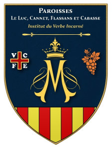 Au milieu sont représentés trois symboles qui décrivent également nos églises et le territoire. Au centre la M avec la couronne: cela représente la Sainte Vierge reine et souveraine de nos vies; cela indique la dévotion à la Vierge présente dans nos paroisses et chapelles: Notre Dame du Mont Carmel (Le Luc), Saint Joseph, époux de la Vierge (Cannet) et Notre Dame de l’Assomption pour Flassans et Cabasse; Notre Dame du Glaive, Notre Dame de la Consolation, etc (chapelles). Au même temps indique la spiritualité mariale que les pères et sœurs du Verbe incarné veulent vivre avec la communauté paroissiale selon les enseignements de Saint Louis Marie Grignion de Montfort: consécration totale à Marie en corps et âme. A gauche nous avons représenté la partie principale du blason de l’Institut religieux du Verbe incarné qui décrit le mystère principal de notre foi catholique: Verbum, Caro, Factum Est… “et le Verbe s’est fait chair” (Jn 1, 14). Ainsi notre mission pastorale est de prêcher Jésus Christ, Verbe de Dieu qui par sa mort et résurrection nous libère du péché et de la mort et nous conduit à la Vie éternelle. A droite, est représenté un raisin qui caractérise les vignes qui entourent chacune de nos paroisses dans le cœur du Var, indiquant en même temps le fruit noble qui représente le repas eucharistique que les catholiques célèbrent chaque dimanche en paroisse.